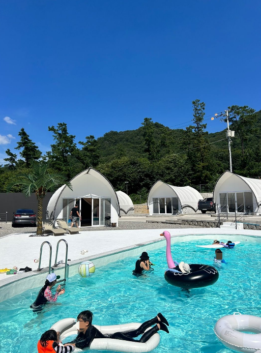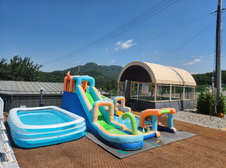 '키즈친화'라는 이름이 아깝지 않게 아이들을 위한 놀거리가 정말 많아요. 보기만 해도 시원한 수영장과 아이들이 방방 뛰며 에너지를 불태울 수 있는 트램펄린(방방이)은 기본이고요, 여름 시즌에는 거대한 워터 에어바운스까지 설치된대요!