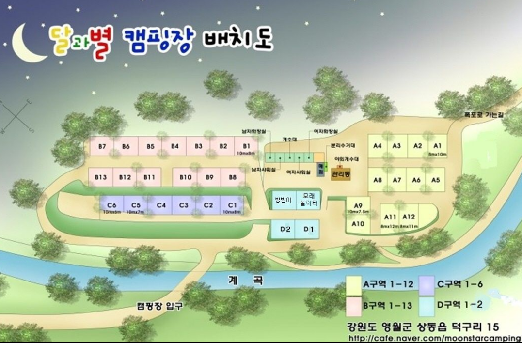 드디어 도착한 영월 달과별 오토캠핑장! 캠핑장 이름처럼 정말 밤하늘의 달과 별이 쏟아질 것 같은 청정한 자연 속에 위치해 있었어요. (전화번호: 050-7976-4599) 강원도 영월군 상동읍에 자리 잡고 있어서 그런지 공기부터가 다르더라고요. 관광사업자로 등록된 인증 캠핑장이라니 더욱 믿음이 갔습니다.