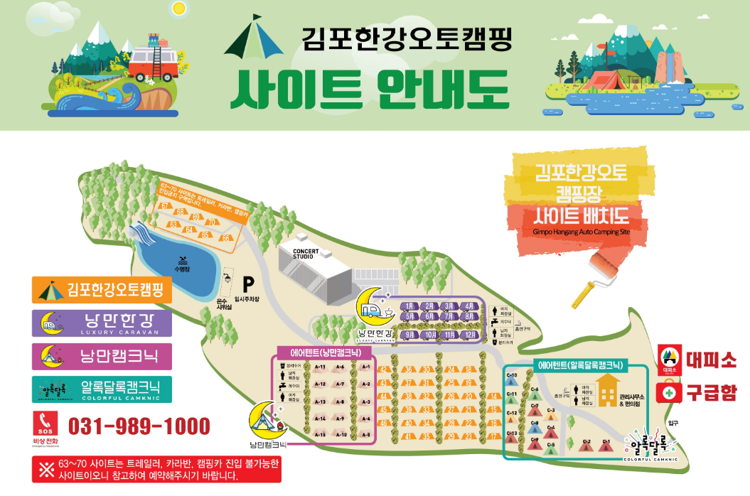 김포한강오토캠핑장의 또 다른 장점은 선택의 폭이 넓다는 점이에요. 캠핑 고수부터 장비 하나 없는 초보까지 모두 만족시킬 수 있는 다양한 숙소 타입이 준비되어 있습니다.
