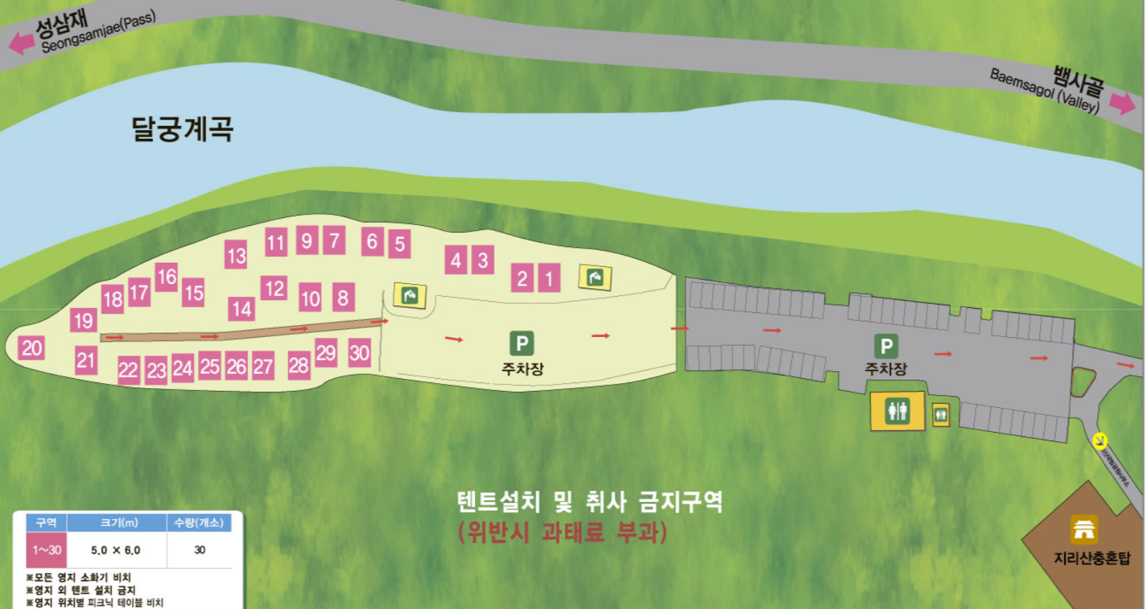 뱀사골2 야영장은 총 30개의 일반 야영지로 구성되어 있어요(A1~A30, 이 중 A30은 예비 영지).