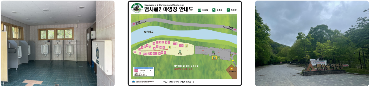 - 화장실: 남녀가 구분된 깨끗한 화장실이 1동 준비되어 있습니다. 모두가 깨끗하게 사용하는 센스가 필요해요!