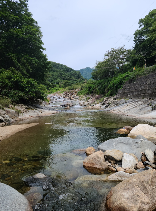 이곳을 선택한 가장 큰 이유! 바로 캠핑장 바로 옆에 흐르는 자연 계곡입니다. 지리산 천왕봉에서부터 흘러내려오는 1급수 계곡물이라 그런지 정말 얼음장처럼 차갑고 맑았어요. 다른 분 후기를 보니 올해 비가 적게 왔는데도 수량이 풍부하다고 하던데, 정말이었어요! 아이들 발목 정도 오는 얕은 곳부터 어른 허리, 가슴까지 오는 깊은 곳까지 수심이 다양하게 구성되어 있어서 남녀노소 모두 안전하고 즐겁게 물놀이를 즐길 수 있습니다. 이건 인공적인 수영장과는 비교할 수 없는 진짜 자연의 선물이었습니다.
