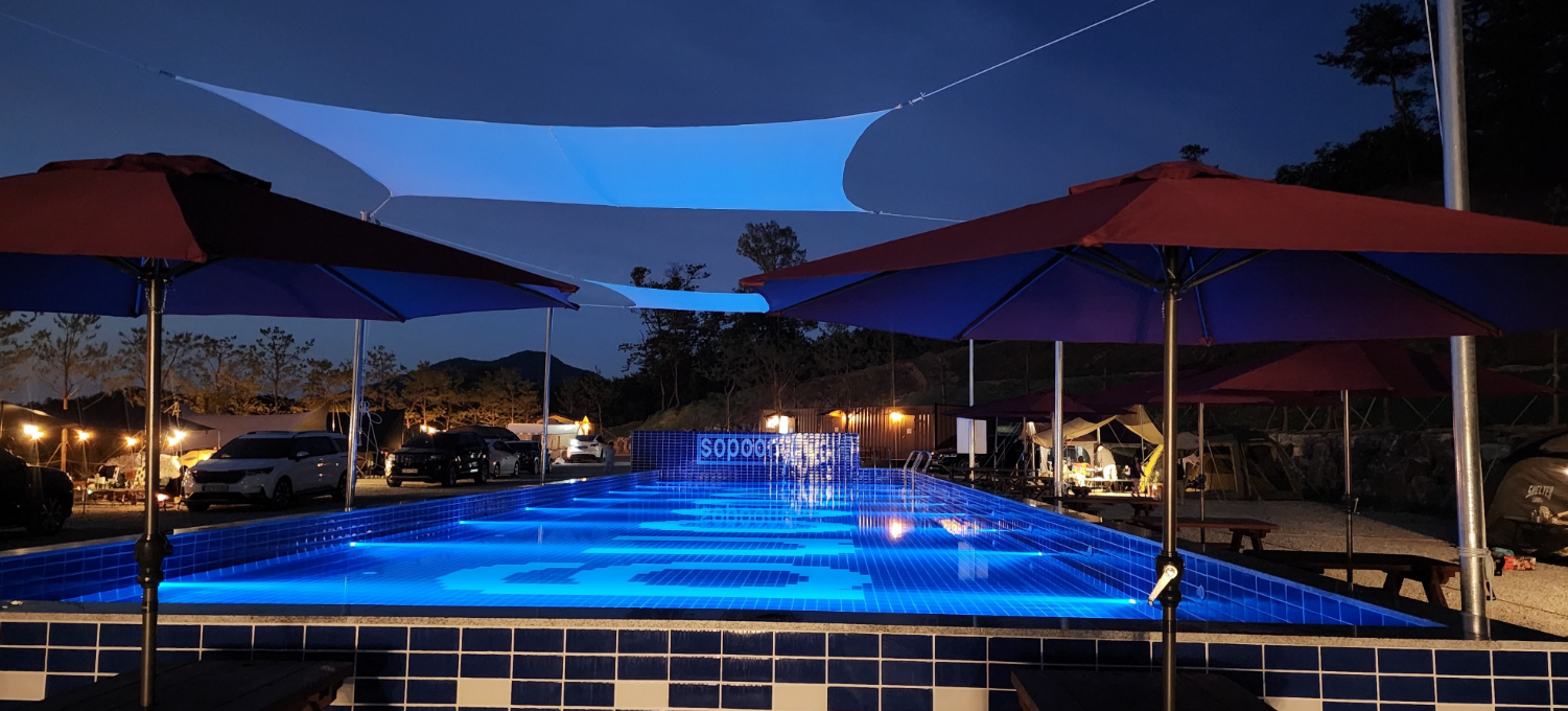 이번 캠핑의 하이라이트! 바로 수영장이었습니다. 솔직히 캠핑장 수영장은 아이들 발목 정도 오는 작은 풀장일 거라 생각했는데, 웬걸요! 용인소풍캠핑장 수영장은 규모가 꽤 커서 어른들도 아이들과 함께 들어가서 물놀이를 즐기기에 전혀 부족함이 없었어요. 수질 관리도 깨끗하게 잘 되고 있어서 안심하고 놀 수 있었고요. 7월의 뜨거운 햇볕 아래서 시원한 물에 몸을 담그니 정말 천국이 따로 없었습니다.