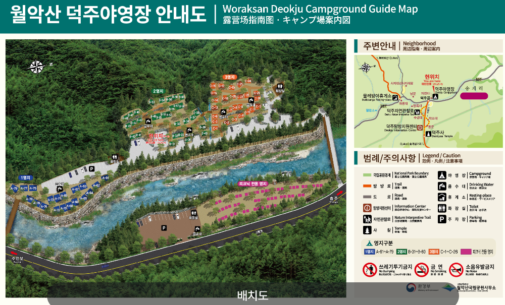 덕주 야영장은 총 66개의 자동차 야영지 로 구성되어 있어요. 구역별로 특징이 조금씩 다르니 잘 보고 취향에 맞는 곳으로 예약해야겠죠?