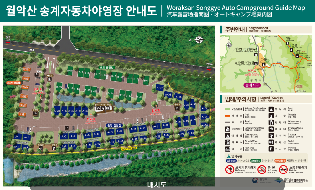 송계 야영장 배치도는 국립공원 예약 시스템 홈페이지에서 확인할 수 있어요. A 구역과 B 구역으로 나뉘어 있고, 카라반 전용 사이트는 별도로 마련되어 있습니다.