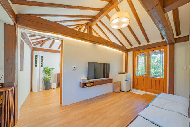 - 구옥안채: 약 66m²(약 20평) 규모로, 최대 4인까지 편안하게 머물 수 있는 메인 침실 공간입니다. 옛집의 서까래나 돌담의 흔적은 고스란히 남겨두면서도, 내부는 현대적으로 깔끔하게 리모델링해서 불편함이 전혀 없었어요. 전통과 현대가 이렇게 잘 어우러질 수 있다니, 감탄이 절로 나왔습니다.