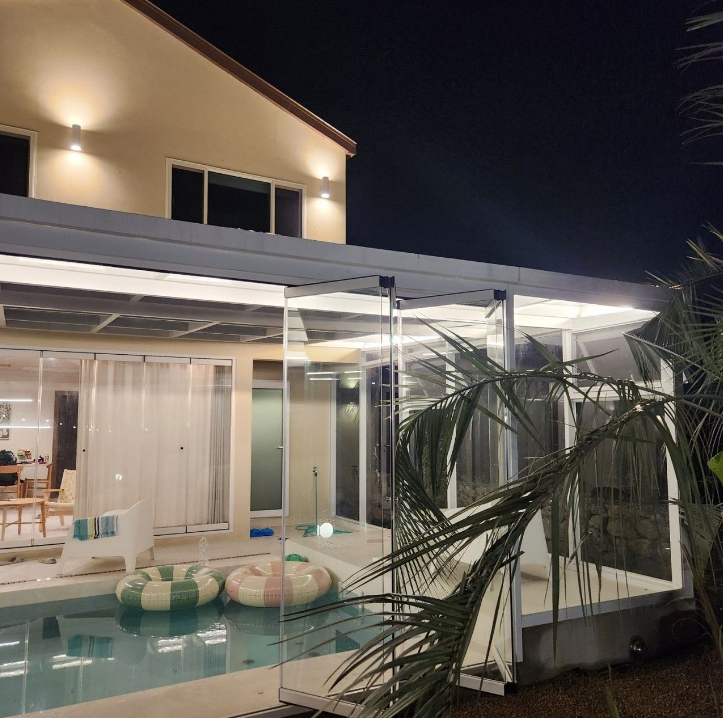 가족 단위 여행객이라면 단연 1동을 추천해요! 무려 165m²라는 넓은 공간에 우리 가족만 단독으로 사용할 수 있는 수영장이 딸려 있습니다. 이게 그냥 수영장이 아니라, 사계절 내내 30~33°C의 미온수가 유지되는 온수풀이라는 사실! 덕분에 날씨에 구애받지 않고 언제든 물놀이를 즐길 수 있어요. 아이들이 있는 집이라면 정말 최고의 선택이 아닐까 싶어요. 다른 사람들 눈치 볼 필요 없이 마음껏 웃고 떠들며 우리 가족만의 추억을 쌓을 수 있답니다. 50평이라는 공간은 4인 가족이 지내기에 전혀 부족함이 없는, 아주 넉넉하고 쾌적한 크기입니다.