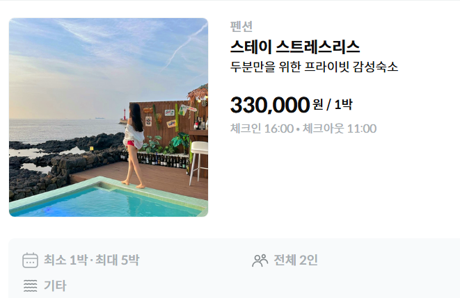 하루 330,000원이라는 가격이 저렴하진 않지만, 이 모든 시설을 오직 둘이서만 프라이빗하게 누릴 수 있다는 점을 생각하면 충분히 그 가치를 한다고 생각해요.