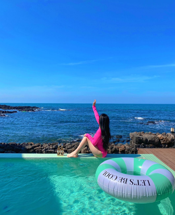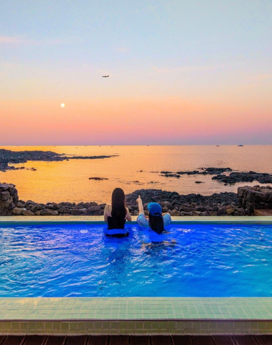 이곳의 하이라이트는 단연 프라이빗 야외 수영장입니다! 사계절 내내 30-33°C의 적정 온도를 유지하는 미온수 풀이라, 제가 방문했던 살짝 쌀쌀한 날씨에도 전혀 문제없이 물놀이를 즐길 수 있었어요. 푸른 제주 바다를 배경으로 유유자적 수영을 즐기는 시간은 정말 꿈만 같았습니다. 특히 해 질 녘 노을을 바라보며 즐기는 수영은 평생 잊지 못할 추억이 되었어요.