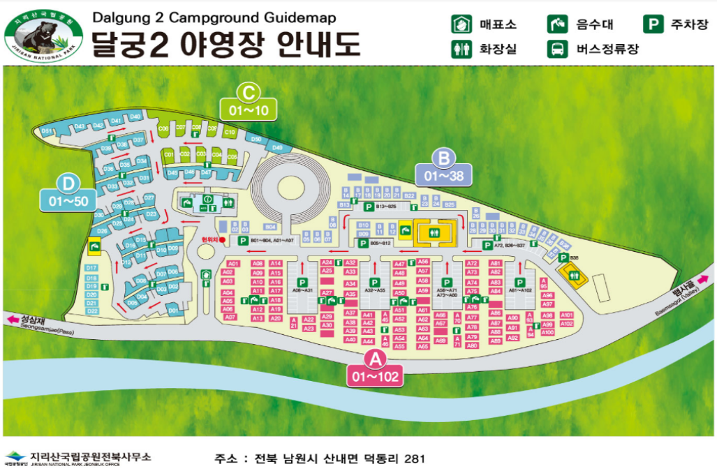 자, 이제 가장 궁금해하실 달궁2 야영장 배치도와 함께 어떤 자리가 좋을지 살짝 엿볼까요? 야영장 선택의 핵심은 바로 자리 아니겠어요?!