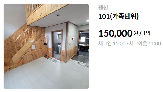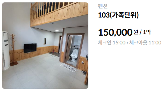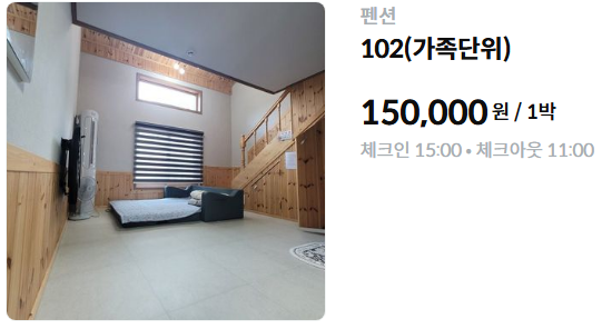- 펜션 101, 102, 103호: 2인 기준의 아담하고 깔끔한 객실이에요. 부부나 커플, 혹은 아이가 어린 3인 가족에게 딱 맞는 크기였어요. 1박에 150,000원으로 합리적인 가격도 매력적이었습니다.