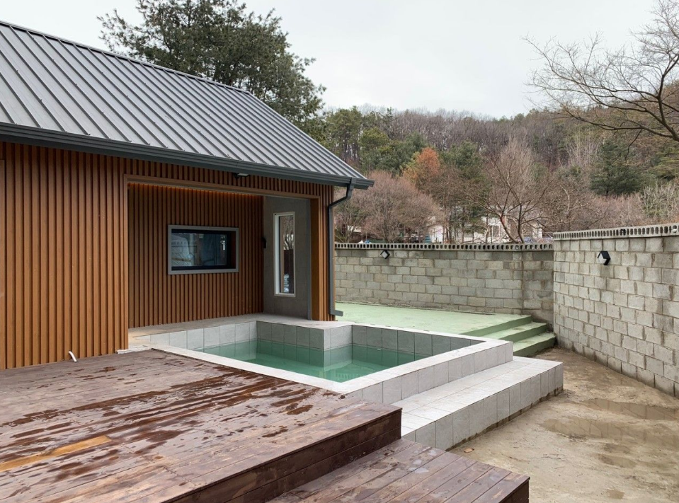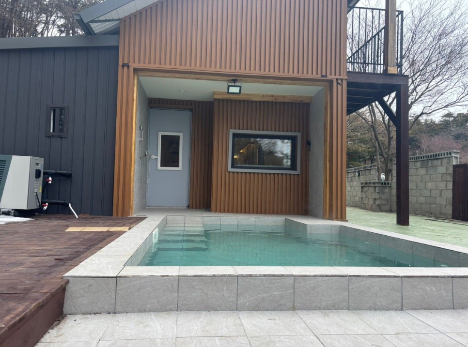 여울바림 펜션의 가장 큰 매력 포인트는 바로 이 사계절 온수 수영장입니다. 보통 여름 한 철만 운영하는 곳이 많은데, 이곳은 계절에 상관없이 따뜻한 물에서 수영을 즐길 수 있다는 점이 정말 특별했어요. 특히 2025년 봄, 아직은 살짝 쌀쌀한 바람이 불 때 방문했는데 따뜻한 물에 몸을 담그니 노곤노곤 피로가 전부 풀리는 기분이었습니다.