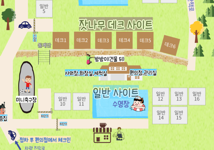 일반 사이트 는 1박에 55,000원이고, 크기는 7m × 8m 로 충분히 넉넉합니다. 수영장이나 공용 편의시설이 가까워서 아이들이 놀기에도 좋고 이동 동선도 편리해요.
