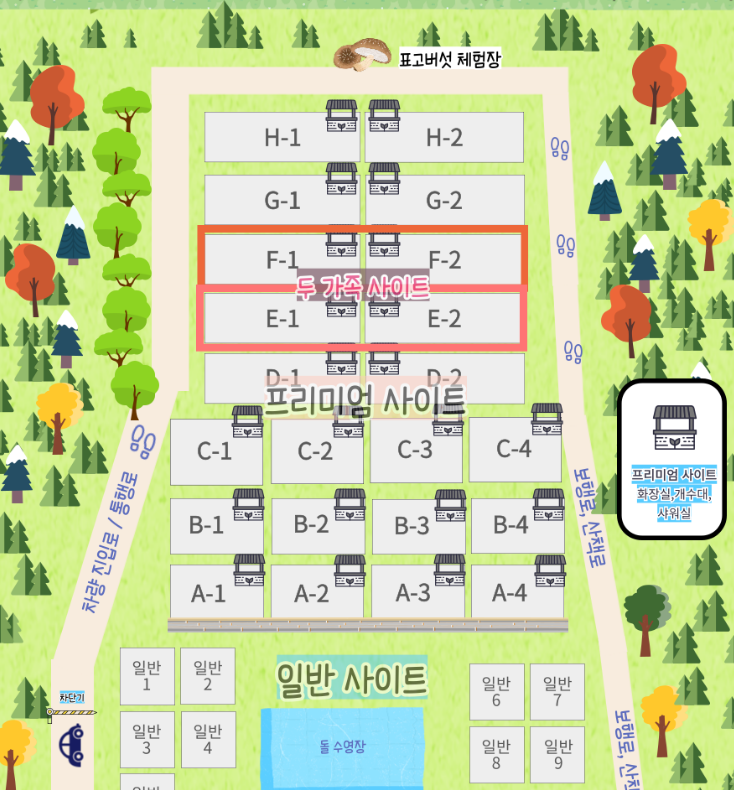 앞서 말한 호텔급 개별 편의시설을 온전히 누리고 싶다면 단연 프리미엄 사이트 를 추천합니다. 1박에 70,000원이며 최소 2박부터 예약이 가능해요. 사이트 크기가 무려 8m × 14m 로 굉장히 넓어서 대형 텐트나 트레일러, 카라반도 여유롭게 설치할 수 있습니다. 다른 사람 신경 쓸 필요 없이 우리 가족만의 완벽한 공간에서 편안한 휴식을 즐길 수 있다는 게 최고의 장점이에요.