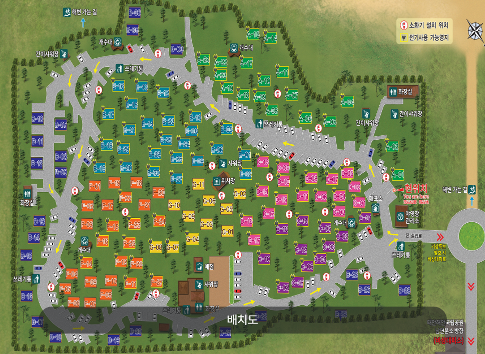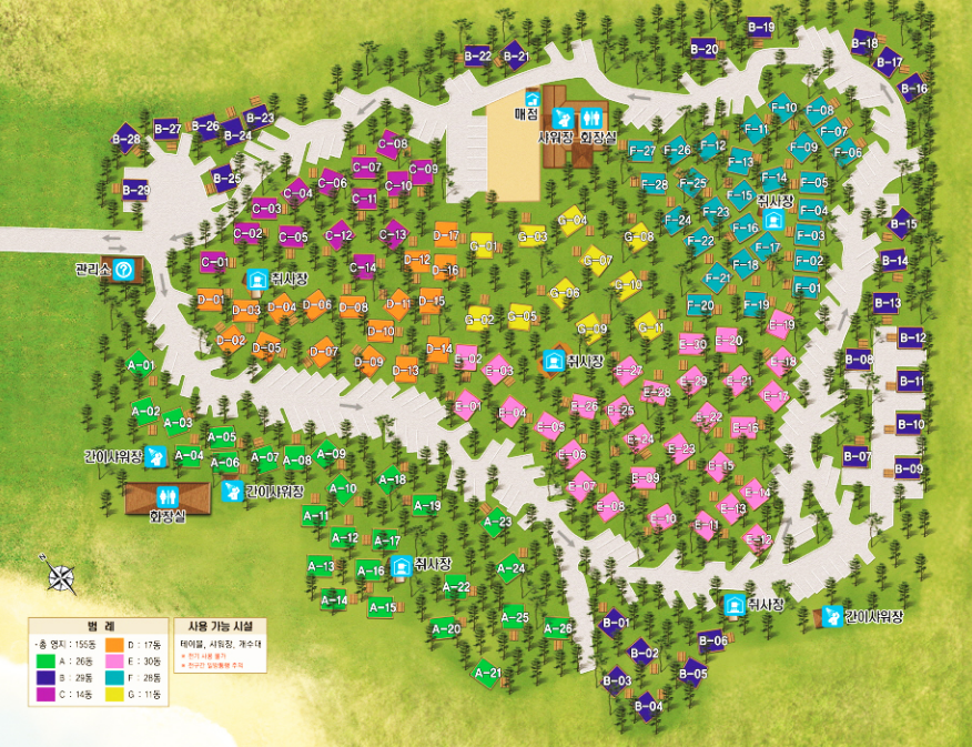 자동차 야영지는 A1번~A24번, B3~B28번, C1~C14번, D1~D17번, E1~E30번, F1~F27번, G1~G11번 으로 구성되어 있습니다. 각 구역마다 장단점이 있으니 배치도를 꼼꼼히 살펴보시는 걸 추천해요!
