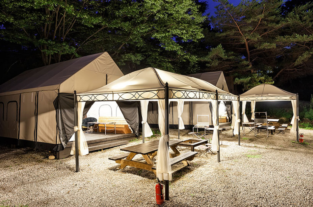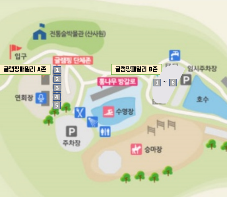도착해서 주차하고 관리동으로 가니 사장님께서 정말 친절하게 맞아주셨어요. 예약 확인부터 글램핑장 이용 안내까지 하나하나 상세히 설명해 주셔서 처음 방문했는데도 전혀 어색함이 없었습니다. 다른 분들 후기에서도 사장님 친절하다는 이야기가 많던데, 정말 사실이었어요. 이런 작은 친절함이 여행의 시작을 기분 좋게 만들어 주는 것 같아요. 저희는 B존에 자리를 잡았는데, 텐트들이 넉넉한 간격으로 배치되어 있어 좋았습니다.