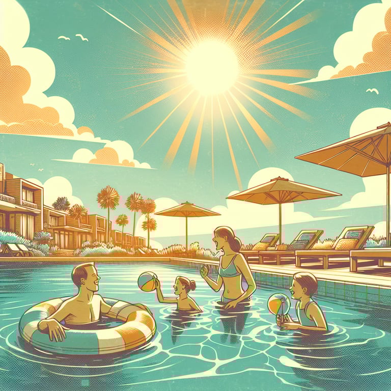 수영장 주변으로는 파라솔과 테이블이 넉넉하게 마련되어 있어 물놀이 중간중간 쉬기에도 정말 편했어요. 부모들은 테이블에 앉아 아이들이 노는 모습을 편안하게 지켜볼 수 있다는 점이 큰 장점입니다. 덕분에 저희 아이들은 오후 내내 물 밖으로 나올 생각을 안 했답니다.