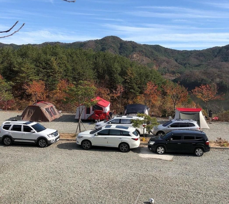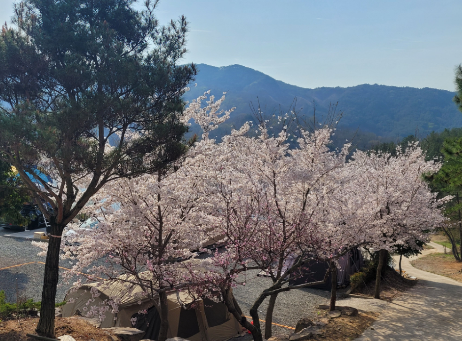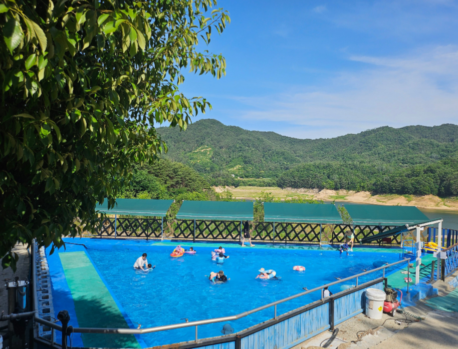 이곳은 계절마다 다른 매력을 뽐내는 곳으로도 유명하더라고요. 제가 갔던 6월은 짙은 녹음이 우거져 시원한 그늘을 만들어주었지만, 후기를 찾아보니 봄에는 캠핑장 전체가 벚꽃으로 둘러싸여 그야말로 벚꽃 캠핑의 성지가 된다고 합니다. 여름에는 아이들이 너무나 좋아할 커다란 삼각 수영장과 트램펄린(방방이)이 있어 더위를 날려버릴 수 있고, 가을에는 느티나무 아래서 호수에 비친 울긋불긋한 단풍을 보며 '물멍'을 즐길 수 있어요. 겨울에는 새하얀 눈과 함께하는 장박의 낭만까지! 정말 사계절의 매력을 오롯이 느낄 수 있는 곳이었답니다.