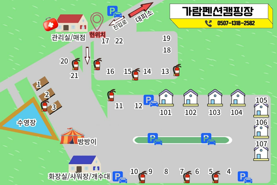 가람펜션캠핑장은 총 22개의 캠핑 사이트와 7동의 독채 미니 펜션으로 구성되어 있어요. 캠핑 스타일이나 동행에 따라 선택의 폭이 넓어서 좋았어요.
