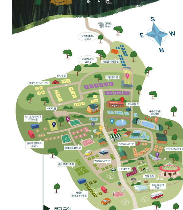 - 밤숲-밤나무존 (데크 3.6m x 7m): 캠핑장의 시그니처 구역으로, 울창한 밤나무 숲 아래서 아늑한 캠핑을 즐길 수 있어요.